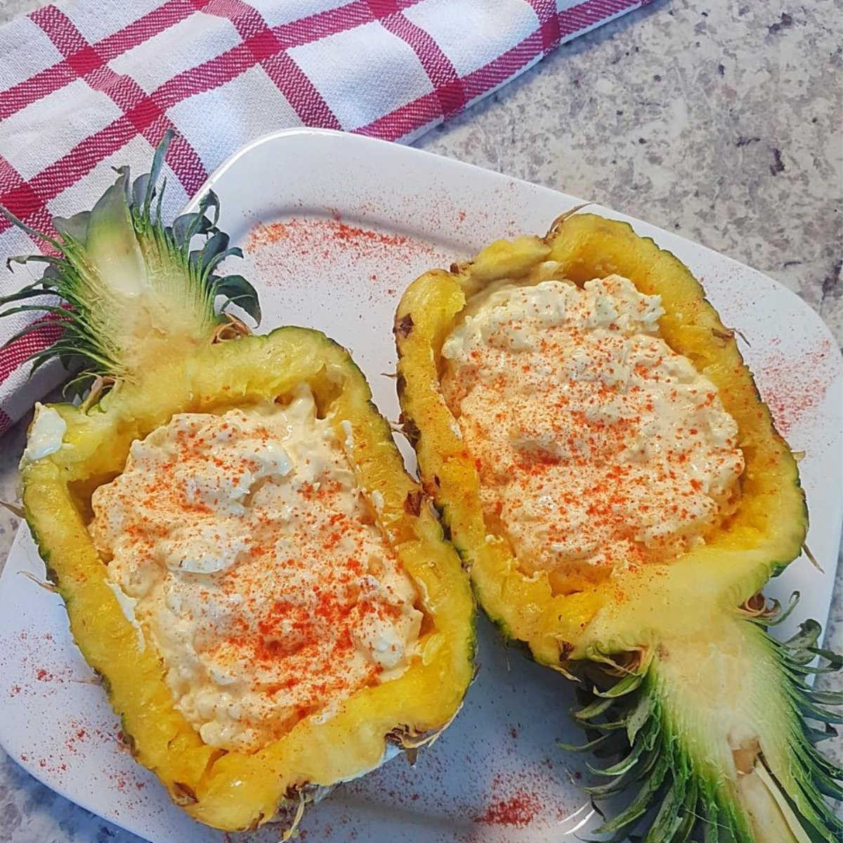 Cut pineapple in half lengthwise (top to bottom). Carve out the insides, leaving 1/2 in intact. Dice up the extracted pineapple, strain excess liquid, and place in a mixing bowl. In a blender or food processor, blend the cottage cheese and hot sauce until smooth and no chunks remain, adding more hot sauce as needed to suit your spice preferences. Add the blended mixture to the mixing bowl and combine with the pineapple chunks. Add salt to taste and mix again. Fill the hollowed out pineapple shells with the dip, sprinkle with paprika, and enjoy! If making ahead of time, wrap the pineapple halves in plastic wrap and place the dip in an airtight container to be refrigerated until ready to assemble and serve.