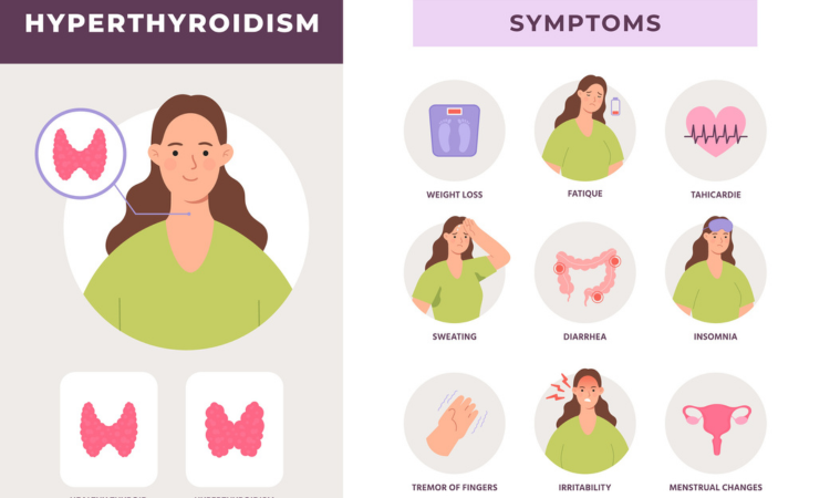 Hyperthyroidism (also known as "overactive thyroid") is when higher than normal hormone production necessary for efficient cell production occurs. Contributing factors may include the autoimmune disorder known as Graves’ Disease, viral infections, or a nodule that has formed on or in the thyroid gland. Symptoms may include:
