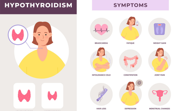 Hypothyroidism (also known as "underactive thyroid") is when lower than normal hormone production necessary for efficient cell function occurs. Common contributing factors may include the autoimmune disorder known as Hashimoto’s Disease, radiation exposure during cancer treatment, or a diet low in iodine. Symptoms may include: